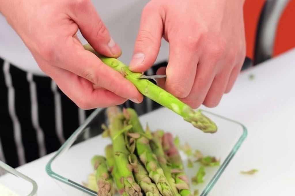 Oczyść szparagi, złam i usuń ich zdrewniałe końce. Podgotuj je przez 5 minut, po czym wystudź.