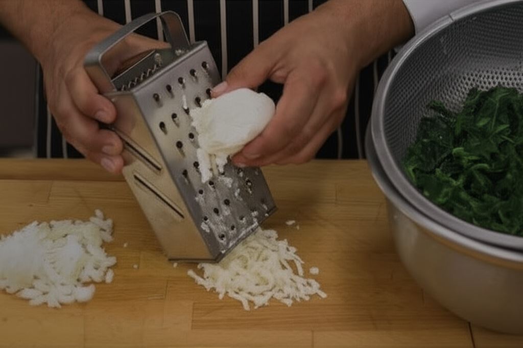 Cebulę posiekaj na drobno i rozdziel na dwie części. Szpinak odmroź i starannie wyciśnij z wody. Ser zetrzyj na tarce.