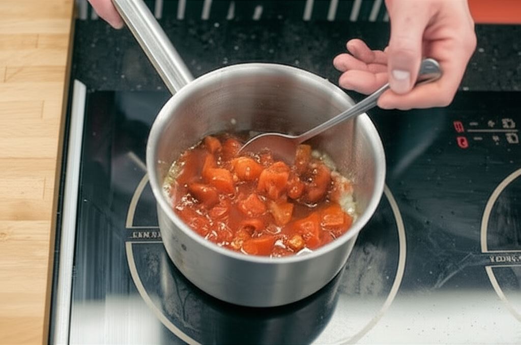 W rondelku podsmaż na oliwie połowę posiekanej cebuli, potem dodaj pomidory wraz z zalewą i doprowadź do wrzenia. Gotuj przez kilka minut na małym ogniu, a następnie zblenduj na gładki sos.