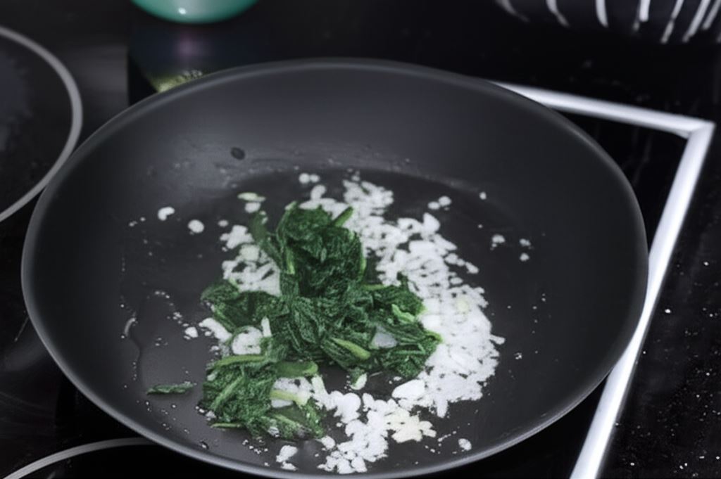 Zeszklij na patelni resztę cebuli. Potem dodaj szpinak i razem smaż przez moment.