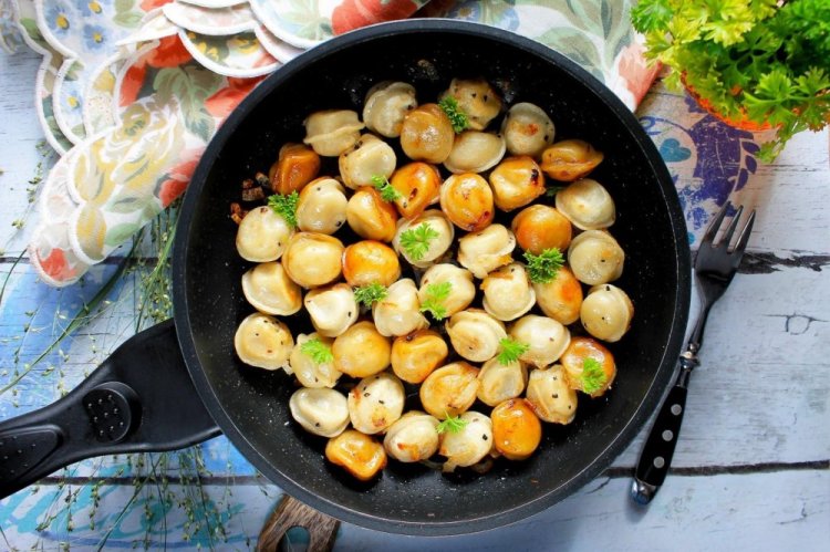 4. Smaż do uzyskania złocistej, chrupiącej skórki. Smaż pielmieni z jednej strony na średnim ogniu przez 5-7 minut, a następnie przewróć na drugą stronę (czas jest orientacyjny, zależnie od patelni).