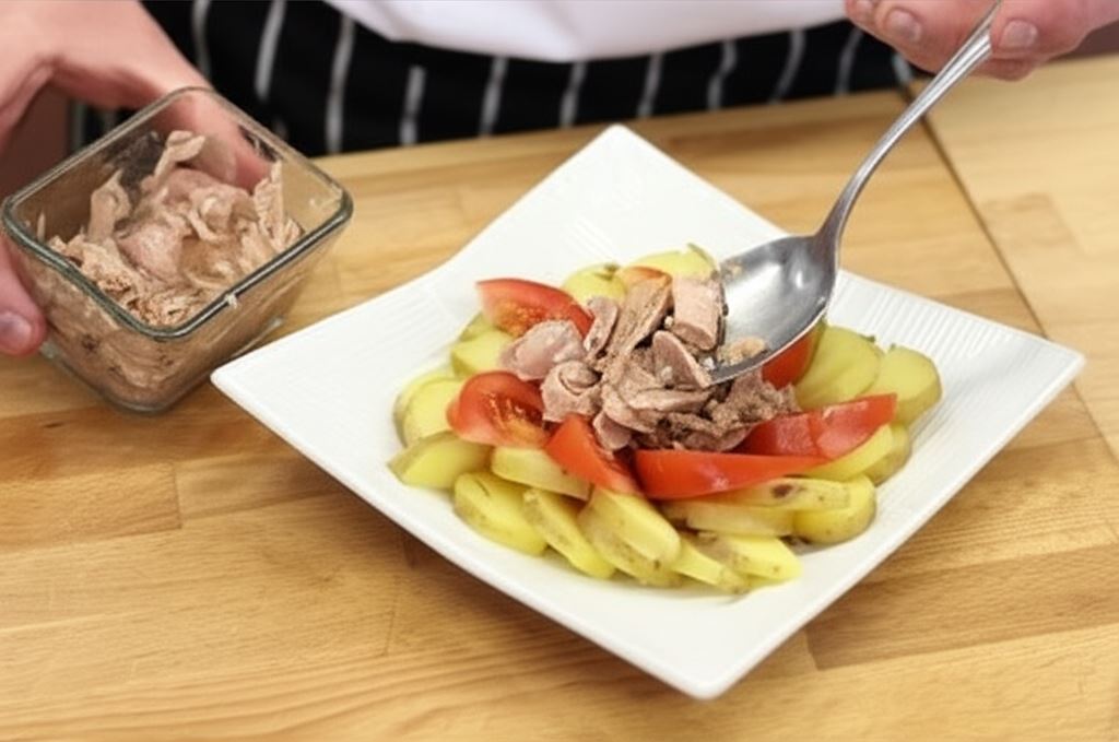 Ziemniaki potnij w półplastry. Ułóż je na półmisku. Pomidora pokrój w ćwiartki i umieść go na ziemniakach. W centrum rozłóż rozdrobnionego tuńczyka.