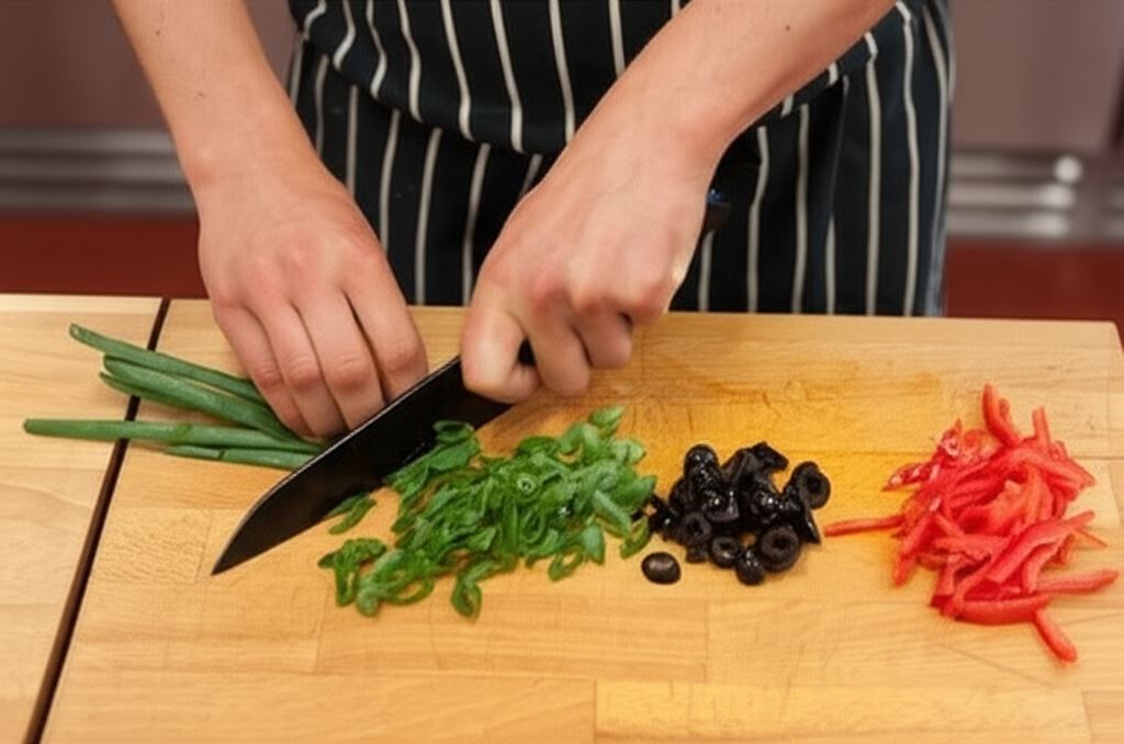 Oliwki przekrój na połówki, paprykę w cienkie paseczki, a szczypiorek drobno posiekaj.