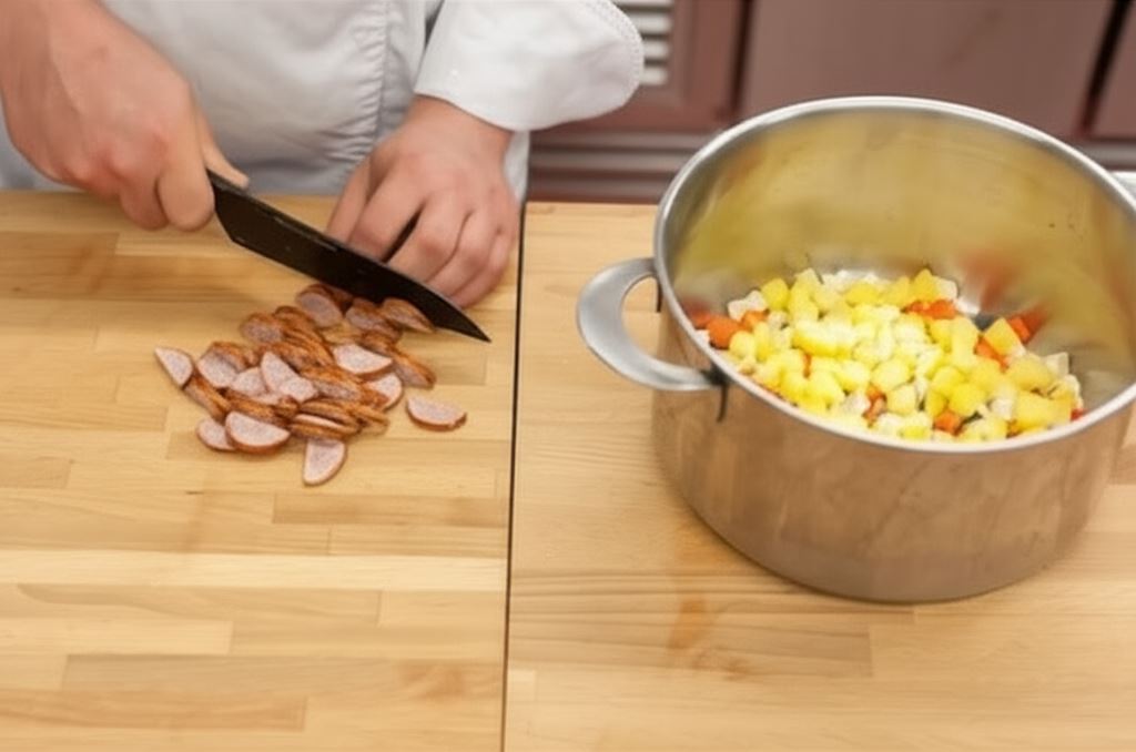 Przygotowanie rozpocznij od pokrojenia ziemniaków w kostkę, a następnie dodaj pokrojoną cebulę i włoszczyznę. Kiełbasę pokrój w półplastry i wrzuć wszystko do garnka razem z grzybami, zielem angielskim i liśćmi laurowymi. Po zagotowaniu i zmiękczeniu warzyw, wystarczy dodać rozmieszany w zimnej wodzie Knorr, aby uzyskać idealną konsystencję i smak. Cały proces zajmie Ci zaledwie 30 minut, a efekt zachwyci całą rodzinę!