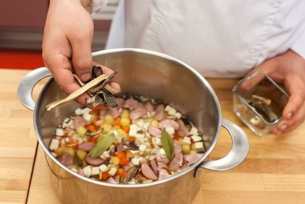 Zalej wszystko 2 litrami wody, wsyp grzyby oraz ziele i liście. Zagotuj do wrzenia, zredukuj ogień i gotuj aż warzywa staną się miękkie.