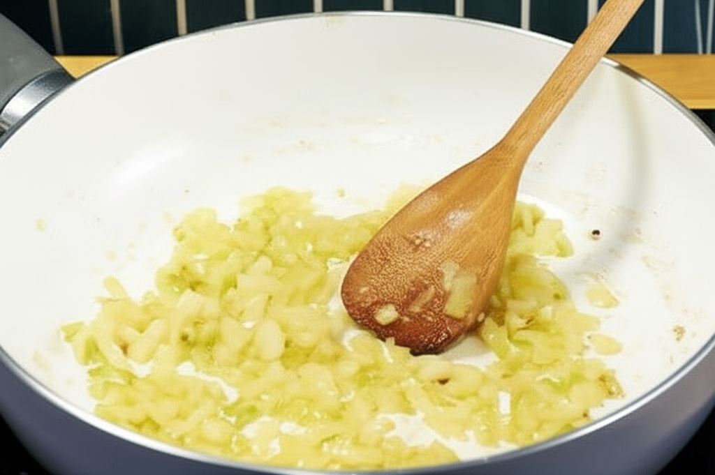 Rozgrzej oliwę na patelni i zesmaż cebulę pokrojoną w małą kostkę.