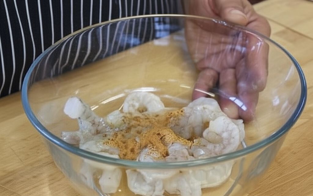 Krewetki połącz z połową czosnku roztartego w soli, oliwą i przyprawą Adobo Knorr. Zamarynowane krewetki usmaż na silnie rozgrzanej patelni żeliwnej. Smaż je stosunkowo krótko, by nie stały się twarde.