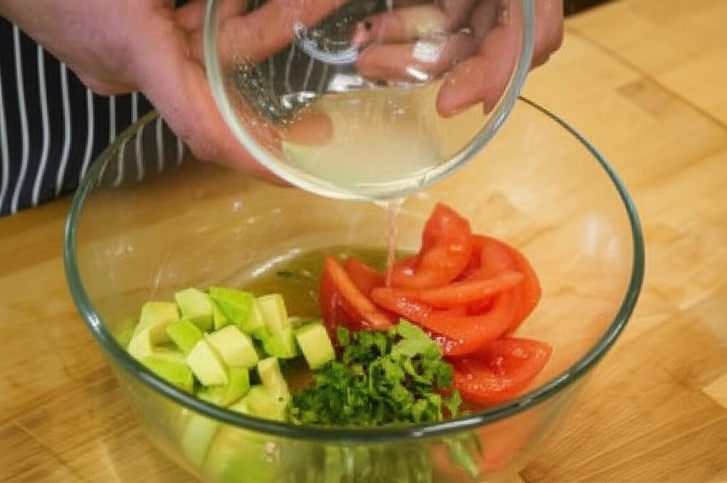 Wymieszaj pomidory, awokado, kolendrę, resztę czosnku, połowę soku z limonki i oliwę. Wszystko razem połącz. Pozostały sok z limonki zmieszaj ze śmietaną.