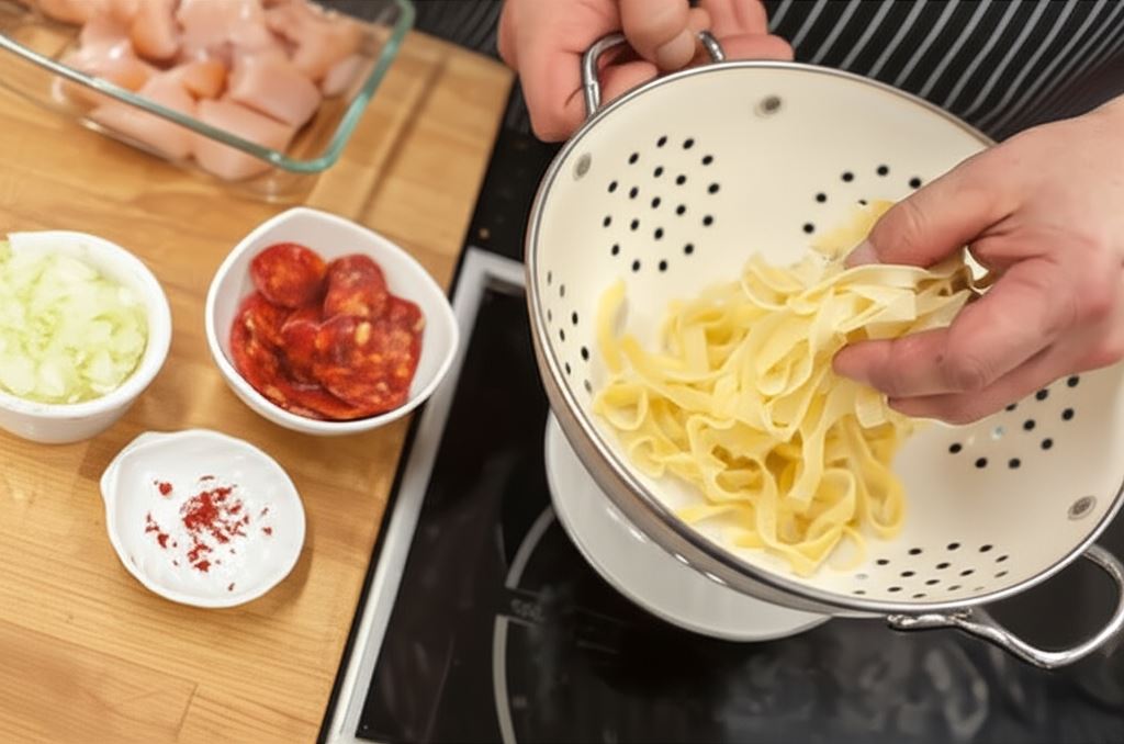 Makaron ugotuj al dente w osolonej wrzącej wodzie, odcedź. Pierś kurczaka pokrój w kostkę 2x2 cm, kiełbasę pokrój na krążki, cebulę posiekaj w drobną kostkę, a chilli drobno posiekaj.