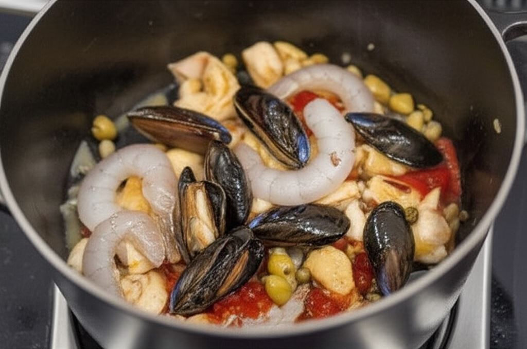 W garnku podgrzej oliwę i obsmaż cebulę, kurczaka, kiełbasę chorizo. Po chwili wsyp pozostałe składniki: krewetki, mule, oliwki, chilli, kapary oraz anchovies. Całość zalej winem, wsyp szafran i gotuj aż płyn odparuje.