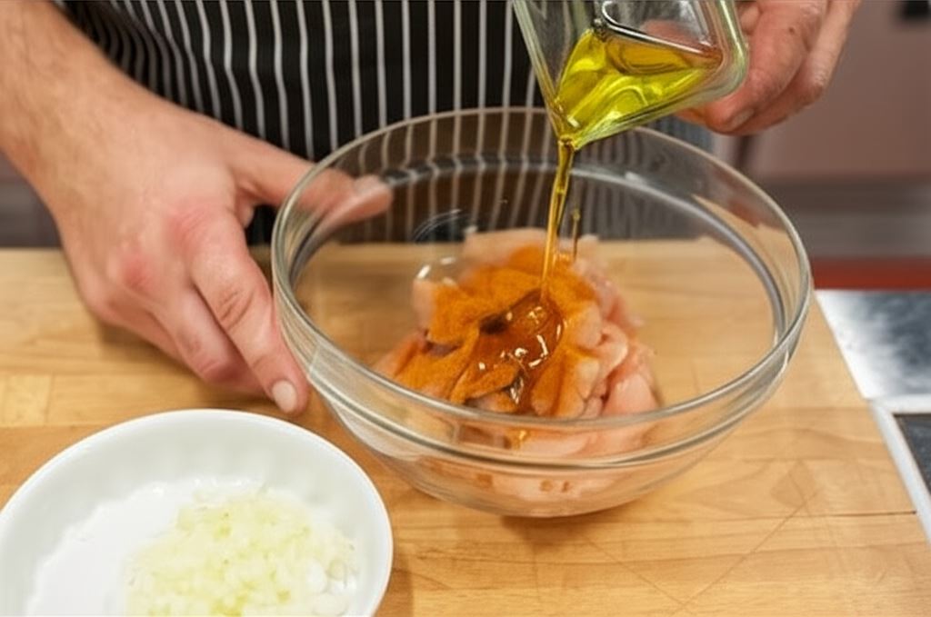 Cebulę posiekaj w kostkę. Pierś kurczaka pokrój w cienkie paski, dodaj 2 łyżki oliwy oraz przyprawę do kurczaka i zamieszaj.