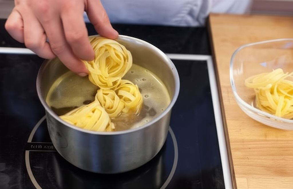 Przygotuj większy garnek, wlej do niego wodę i wsyp Rosół szlachetny drobiowo-wołowy Knorr. Makaron tagliatelle ugotuj zgodnie z instrukcją na opakowaniu i odcedź.