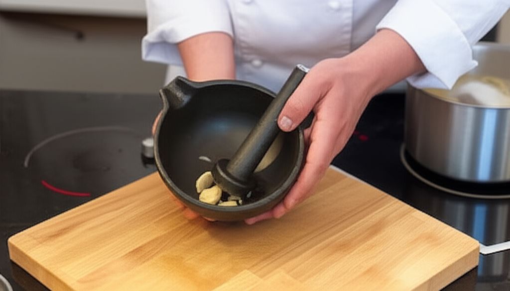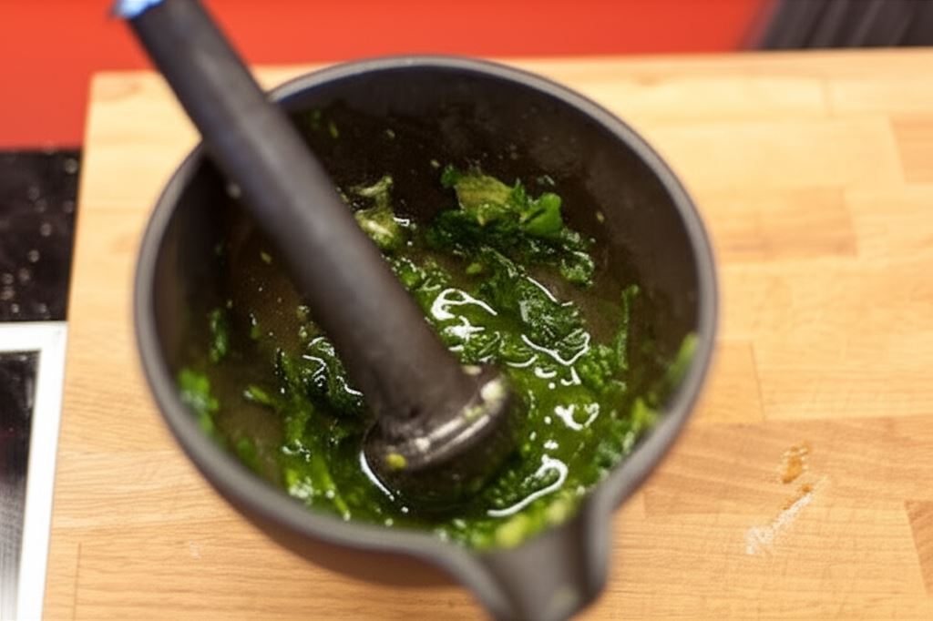 Przygotuj moździerz z tłuczkiem kuchennym. Umieść w nim czosnek, rozgnieć i starannie rozetrzyj.