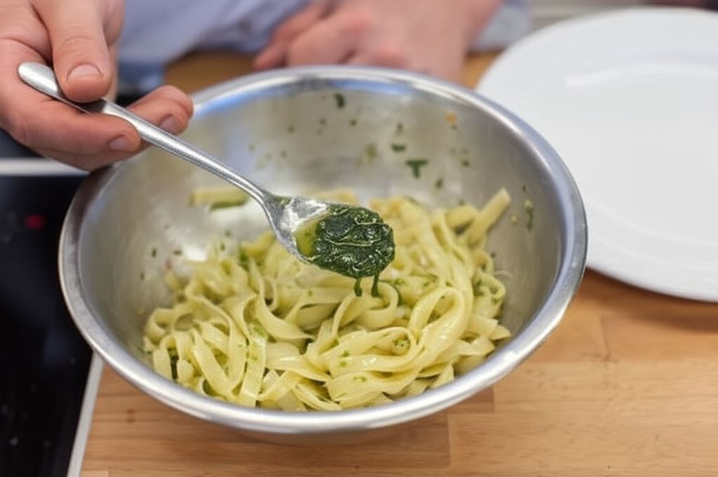 Kluczem do idealnego połączenia pesto z makaronem jest dodanie sosu do jeszcze ciepłego tagliatelle. Wysoka temperatura pomaga składnikom się połączyć, tworząc jedwabistą konsystencję, która idealnie otula każdy kawałek makaronu. Warto też zachować odrobinę wody z gotowania – jej dodatek pomoże uzyskać kremową teksturę dania.