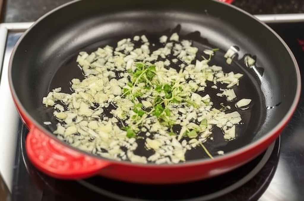 Cebulę posiekaj w kostkę i zrumień na rozgrzanym oliwie, wsyp pozostałą gałązkę tymianku. Wszystko zalej winem i gotuj aż do odparowania płynu.