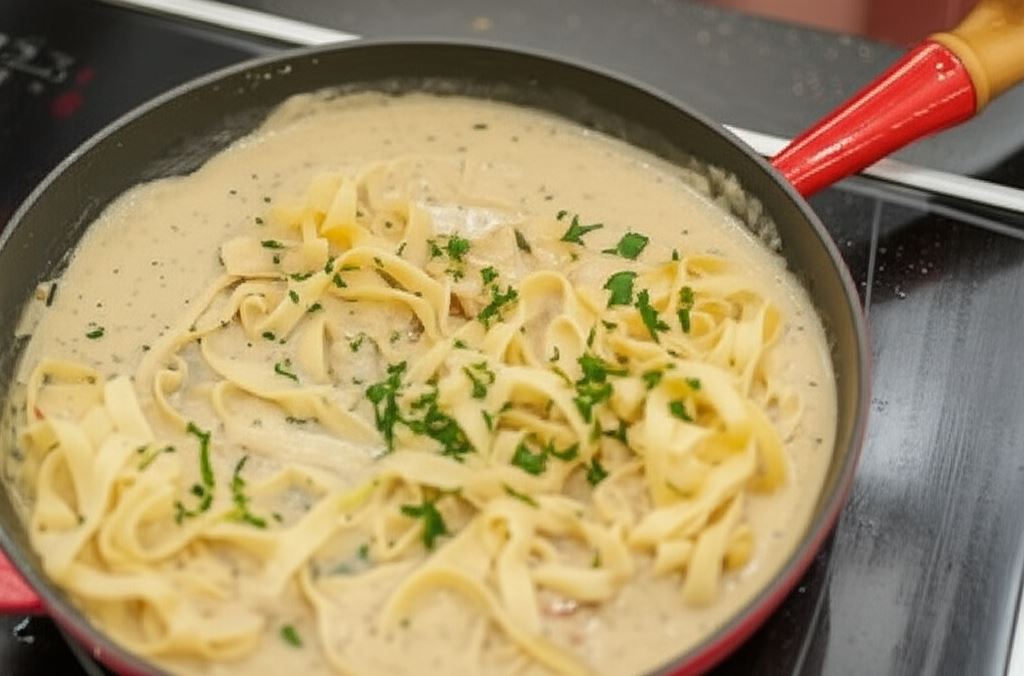 Tagliatelle z kurczakiem Knorr wymieszaj ze śmietaną, wlej na patelnię i doprowadź do wrzenia. Zredukuj ogień, wsyp pokruszony ser i gotuj przez kolejne 2 minuty.