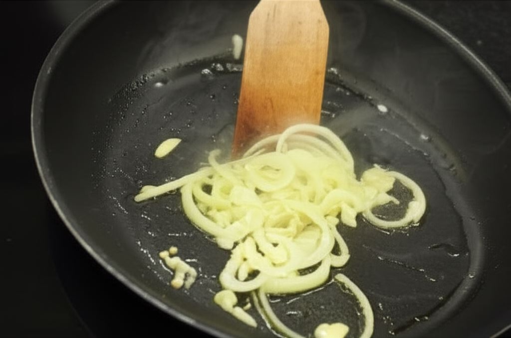 Na rozgrzanej oliwie zrumień pokrojoną w plastry cebulę i posiekany czosnek.