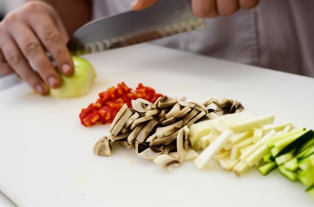 Pokrój cukinię i seler na słupki, pieczarki na plasterki, a paprykę i cebule w kostkę.