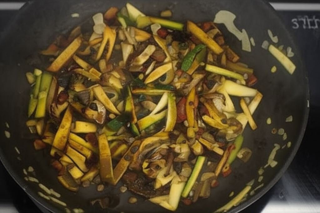 Zrumień paprykę, seler i cebulę na oliwie, po czym wsyp cukinię i pieczarki. Przypraw całość przyprawą Knorr.