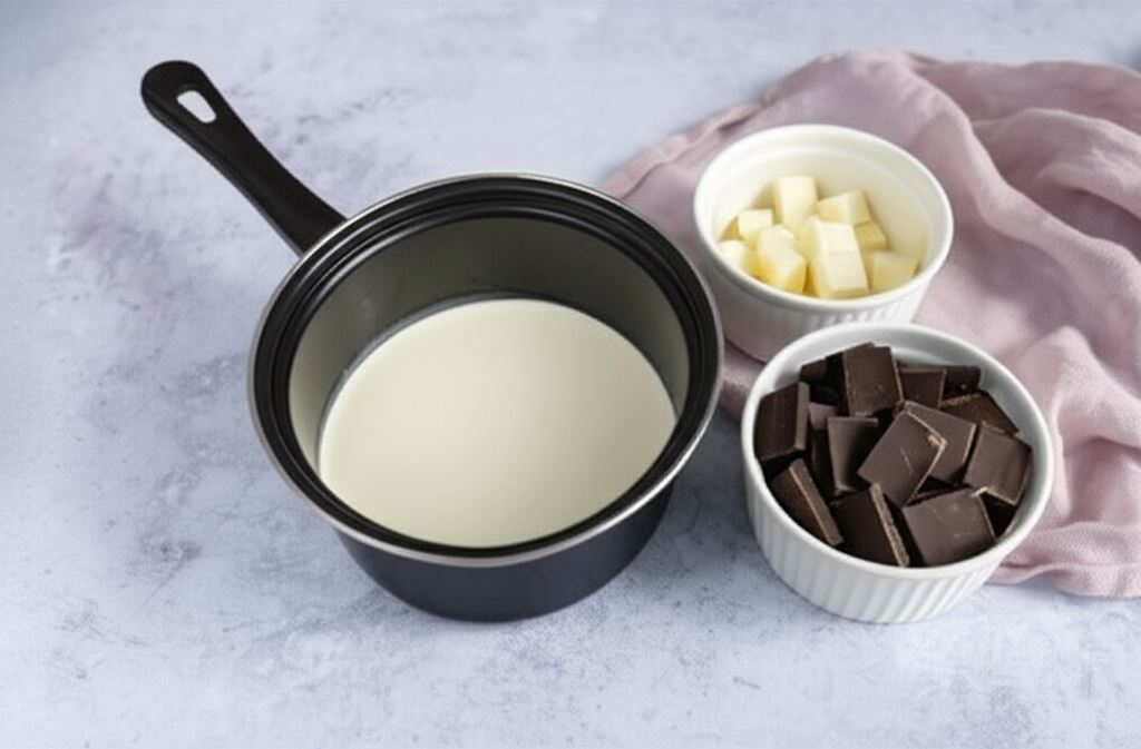 Śmietankę przelej do garnuszka. Ogrzej niemal do punktu wrzenia. Dodaj natychmiast czekoladę połamaną na drobniejsze kawałki. Zamieszaj. Dodaj na końcu masło. Wymieszaj wszystko.