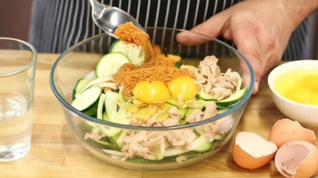 W obszernej misce wymieszaj tuńczyka z puszki z saszetką Naturalnie Smaczne! Spaghetti Bolognese. Potem wsyp umytą i pokrojoną na cienkie plastry cukinię, cebulę w plastrach, jajka oraz ½ szklanki wody. Wszystko starannie połącz.
