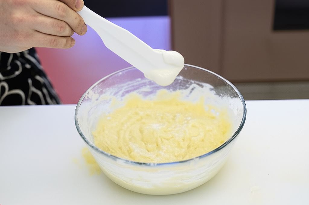 Białka ubij z niewielką ilością soli na sztywną pianę, potem dodaj do masy i ostrożnie wymieszaj.