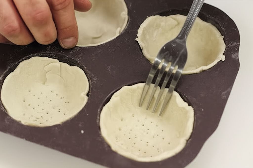 Przygotuj foremki do wypieku o średnicy 8-10 centymetrów. Ciasto francuskie rozwałkuj na grubość 2 milimetrów. Potem przy pomocy jednej z foremek wytnij krążki z ciasta i umieść je na dnie każdej foremki. Nakłuj widelcem wszystkie tartaletki i piecz w piekarniku rozgrzanym do 200 stopni przez około 5 minut.