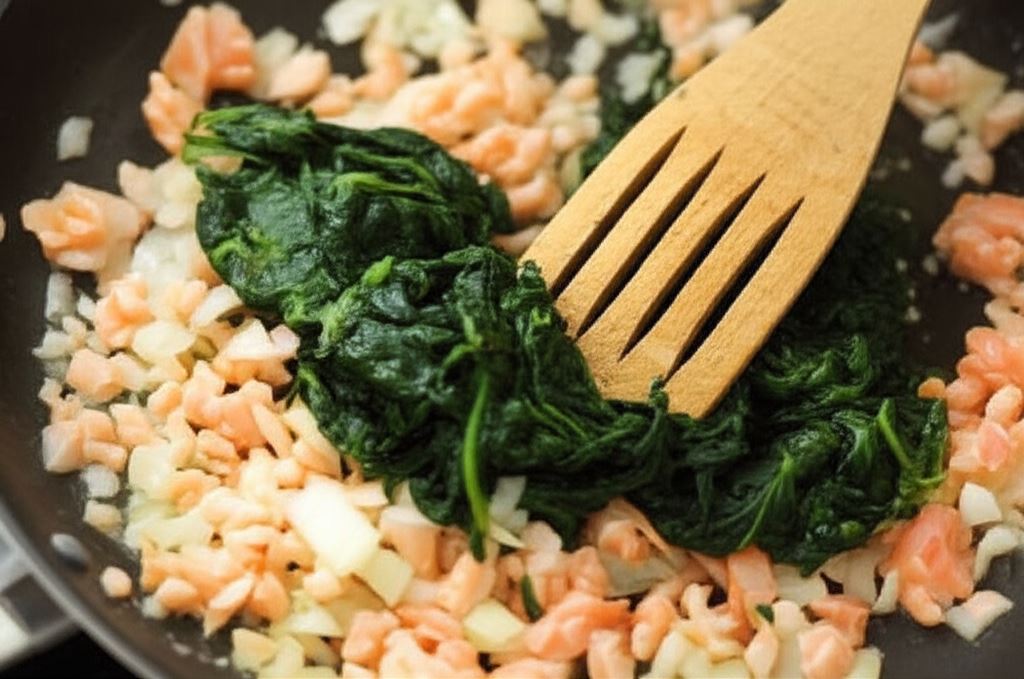Łososia i cebulę pokrój w kostkę i podsmaż w garnku na oliwie. Dodaj szpinak i smaż razem przez moment.