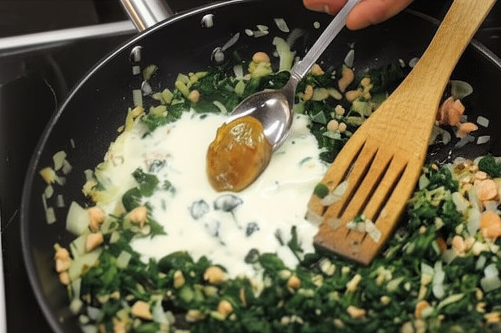 Dodaj śmietanę i Bulion warzywny Knorr do podsmażonych składników. Zagotuj i zredukuj.