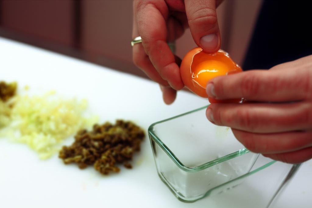 Cebulę, ogórki i kapary posiekaj osobno. Oddziel żółtka od białek.