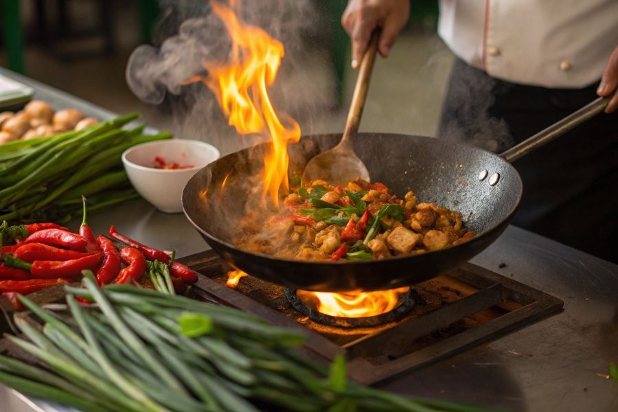Sekret idealnego Gai Pad Med Mamuang tkwi w odpowiedniej kolejności dodawania składników oraz utrzymaniu wysokiej temperatury podczas całego procesu smażenia.