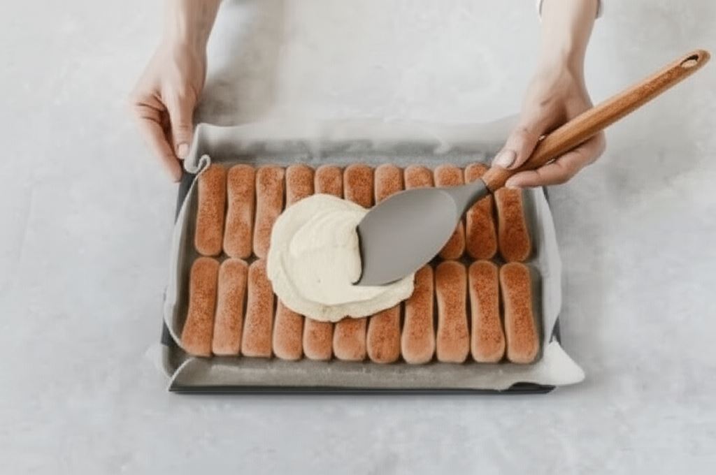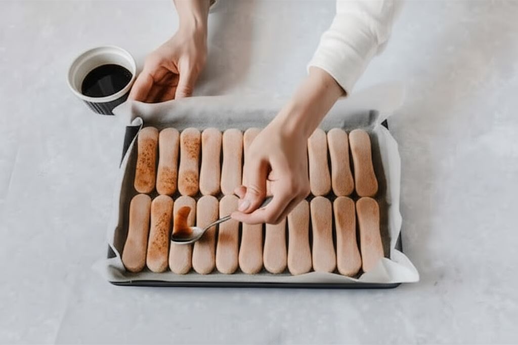 Naczynie na deser tiramisu wyścielamy papierem do pieczenia. Rozkładamy pierwszą warstwę biszkoptów w dwóch rzędach. Nasączamy je połową porcji zaparzonej i wystudzonej kawy.