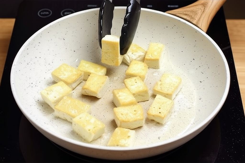 Tofu wyjmij z opakowania, odcedź, lekko odciśnij na papierowym ręczniku, po czym pokrój w dużą kostkę i skrop olejem. W oddzielnym garnku ugotuj ryż według instrukcji zamieszczonej na opakowaniu. Na dobrze rozgrzanej patelni umieść kostki tofu i smaż krótko z każdej strony na złoty kolor. Odstaw na bok (możesz położyć na kawałku kuchennego ręcznika do odcieknięcia).