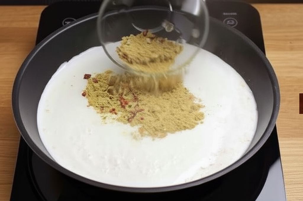 W suchym rondlu podpraż wiórki kokosowe, regularnie mieszając, aby ich nie przypalić. Kiedy uzyskają kolor, wsyp napój kokosowy i Fix Knorr. Wszystkie składniki dokładnie wymieszaj, doprowadzając do wrzenia.