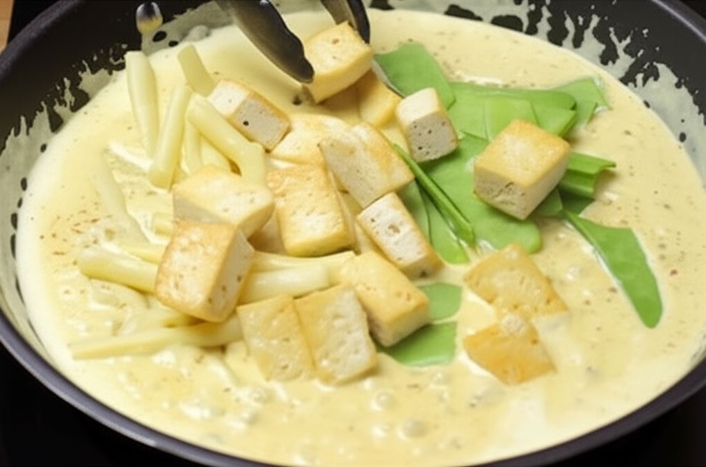 Delikatne tofu w aromatycznym sosie curry to prawdziwa podróż do świata orientalnych smaków. Złociste kostki tofu otulone kremowym sosem kokosowym z nutą pikantnego curry tworzą harmonijną kompozycję, która zachwyci nawet najbardziej wymagające podniebienia. Sekret tej potrawy tkwi w odpowiednim przygotowaniu tofu – delikatnie odciśnięte i zrumienione na patelni nabiera przyjemnej tekstury, doskonale komponującej się z aksamitnym sosem. Świeża fasolka dodaje potrawce chrupkości, a cieniutkie plasterki chili wprowadzają subtelną pikantność, która rozgrzewa i pobudza zmysły.