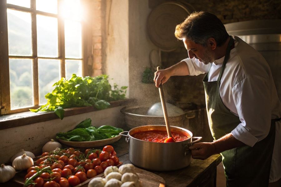 Sekret szefów kuchni: Prawdziwy neapolitański sos pomidorowy nie zawiera cukru. Słodycz powinna pochodzić wyłącznie z dojrzałych pomidorów. Jeśli pomidory są kwaśne, wydłuż czas gotowania zamiast dodawać cukier.
