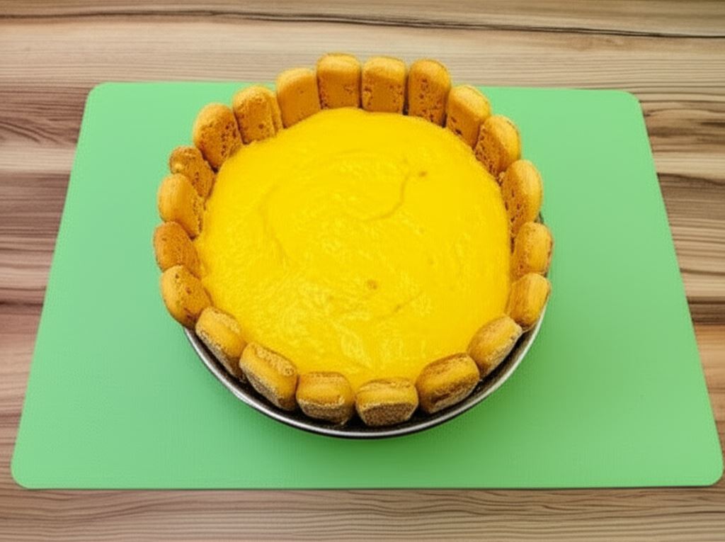 Tortownicę zamocujcie na papierze do pieczenia. Każdy biszkopt przytnijcie równomiernie o około 5 mm z jednej strony. Ubijcie śmietanę aż zgęstnieje. Do lekko tężejącej masy z mango w trzech porcjach dodawajcie śmietanę, dokładnie mieszając szpatułką, ale ostrożnie, aby nie zbić śmietany. Na środek tortownicy wyłóżcie jedną trzecią tężejącej masy, pozostawiając ok. 1 cm wolnej przestrzeni do obręczy tortownicy. Pomiędzy masę a tortownicę umieśćcie pionowo biszkopty – przyciętą częścią na dół. Wyłóżcie resztę masy, wyrównajcie i włóżcie do lodówki.