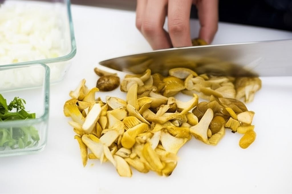 Cebule posiekaj drobno. Grzyby po oczyszczeniu, opłukaniu i osuszeniu pokrój na plastry. Natkę pietruszki drobno posiekaj.