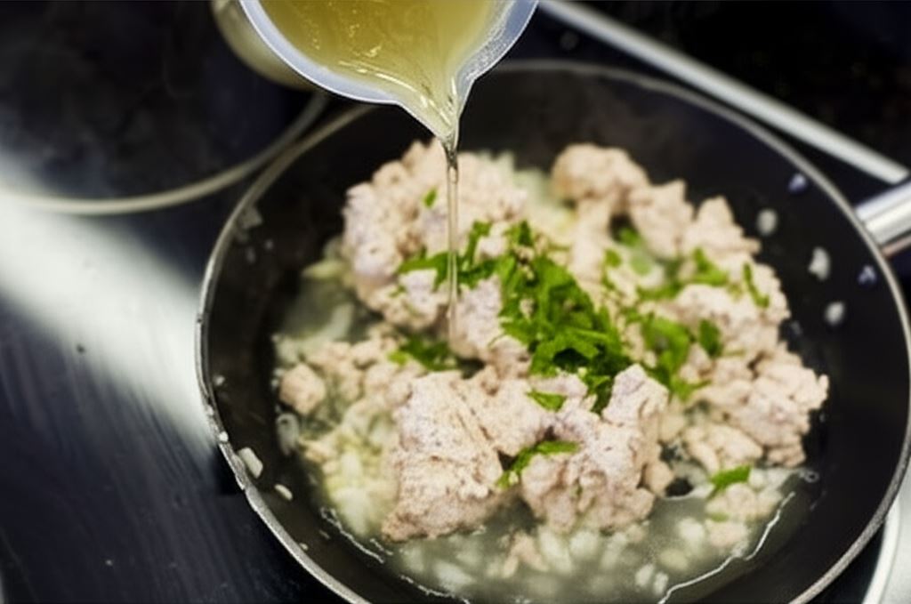 Na rozgrzanym tłuszczu zeszklij cebulę, wsyp mięso, posiekaną natkę pietruszki, mini kostkę Knorr i zalej odstawionym wywarem. Doprowadź do wrzenia.
