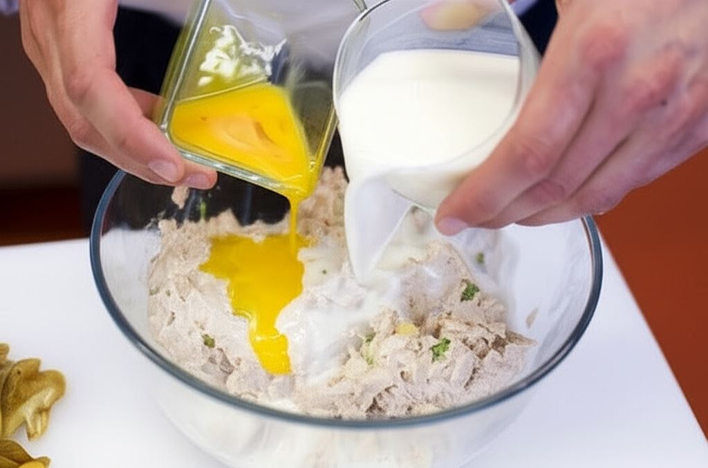 Chłodną mieszankę mięsną połącz z żółtkami i ½ szklanki mleka. Białka z 2 jajek ubij, wprowadź do mieszanki.