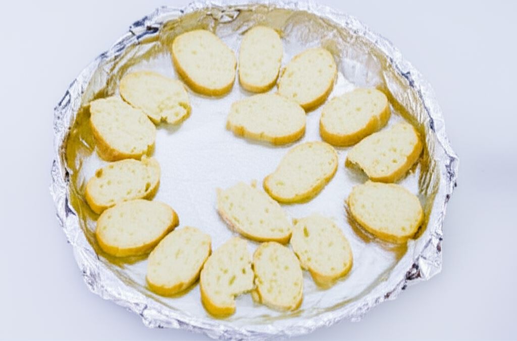 Formę tortową wyłóż folią aluminiową, bułkę podziel na kromki, zamocz je w mleku z jajkiem, umieść na spodzie.
