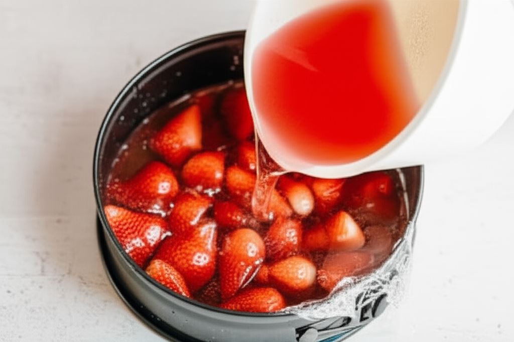 Galaretki rozpuść w 800 ml wody. Przygotuj 3 foremki o średnicy podobnej do formy na biszkopt. Wyłóż je folią spożywczą. Na spodzie umieść przekrojone truskawki. Zalej je niezbyt gorącą galaretką. Wstaw do lodówki, aby zastygła.