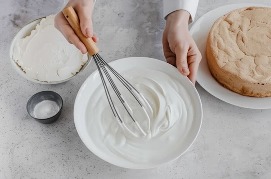 Wychłodzoną śmietanę kremówkę delikatnie ubij. Wsyp serek mascarpone, cukier puder, cukier waniliowy, utrwalacz do bitej śmietany i krótko zmiksuj.