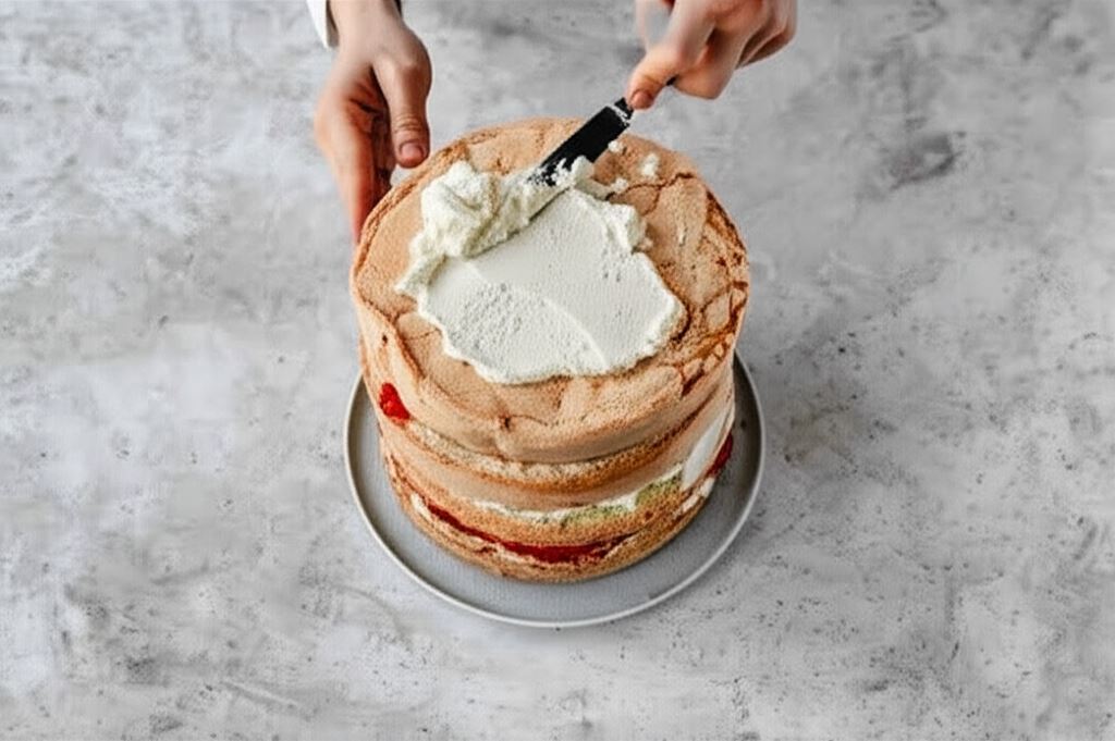 Na ciasto Unicorn połóż pierwszą cienką warstwę kremu. Potem pierwszy blat galaretki. Galaretkę nakryj drugim blatem ciasta. Operację powtarzaj, aż do wykorzystania składników.