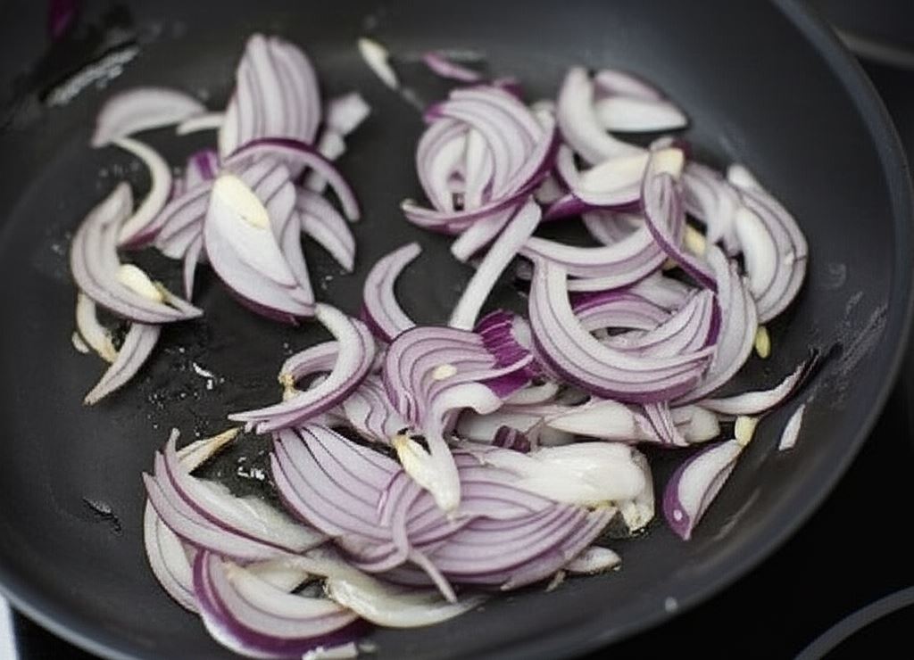 Cebule posiekaj w piórka i przesmaż na gorącym oleju, aż uzyskają intensywnie złocisty kolor.