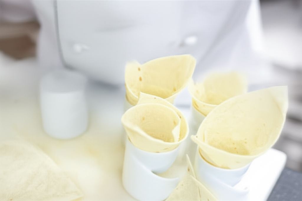 Każdą tortillę przetnij na połowę. Z uzyskanego półokrągłego placka uformuj rożek.