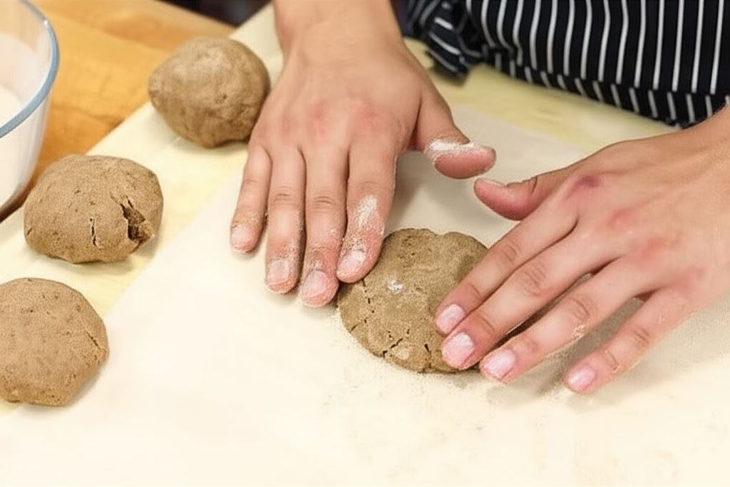 Ciasto na tortille z mąki gryczanej wyrabiaj aż stanie się gładkie i elastyczne, po czym podziel je na cztery kule średniej wielkości. Każdą kulę oddzielnie spłaszcz w dłoniach i umieść na kawałku pergaminu. Ciasto nakryj od góry następnym kawałkiem pergaminu i rozwałkuj na grubość około 2 mm. Po rozwałkowaniu posyp ciasto z wierzchu mąką.