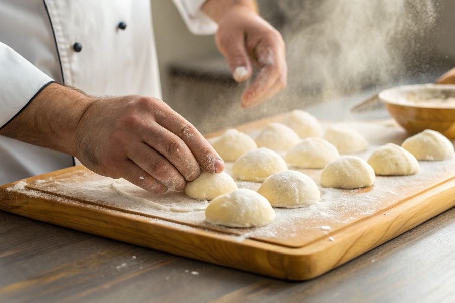 Profesjonalna wskazówka: Formuj kopytka lekko oprószonymi mąką dłońmi, a nie naciskaj zbyt mocno podczas wałkowania wałeczków – nadmierny nacisk zwiększa lepkość ciasta.