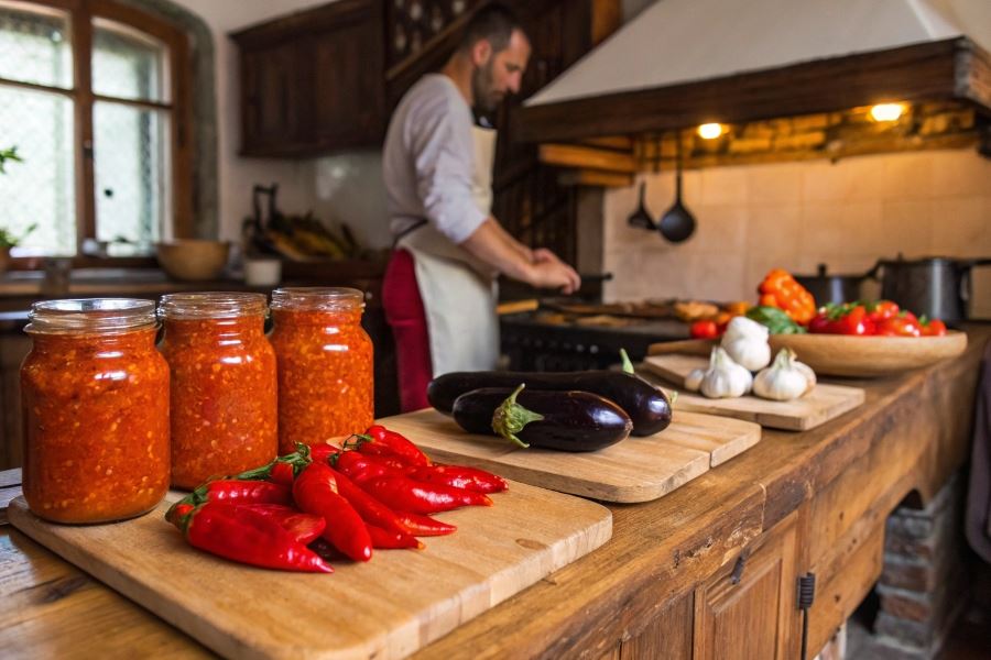 Ajwar to tradycyjna pasta warzywna pochodząca z regionu Bałkanów, szczególnie popularna w Serbii, Macedonii Północnej, Bośni i Hercegowinie oraz Chorwacji. Ta gęsta, aromatyczna pasta wywodzi się z kuchni wiejskiej, gdzie stanowiła doskonały sposób na przetworzenie i przechowanie jesiennych zbiorów papryki. Nazwa „ajwar” pochodzi od tureckiego słowa „havyar” (kawior), co świadczy o wpływach osmańskich na kuchnię bałkańską. W tradycji bałkańskiej ajwar przygotowuje się we wrześniu i październiku, kiedy papryka osiąga pełnię dojrzałości, a proces wytwarzania często angażuje całe rodziny i społeczności.