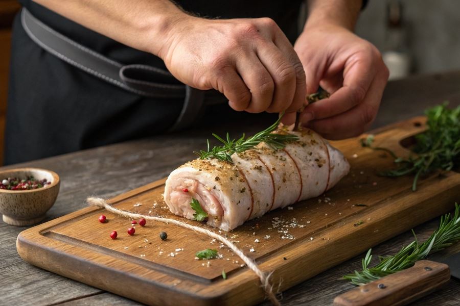 Przygotowanie mięsa rozpocznij od dokładnego umycia filetu i osuszenia go ręcznikiem papierowym. Następnie usuń wszystkie błony i ścięgna, zachowując mięso w jak największym, jednolitym kawałku. Ważne jest, aby filet był świeży i wysokiej jakości – to podstawa dobrego baleronu.